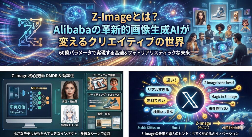 2025年11月、AlibabaのTongyi LabがリリースしたZ-Imageは、画像生成AIの新時代を象徴するモデルです。わずか60億パラメータで、商用レベルのフォトリアリスティックな画像を高速生成可能。従来の巨大モデルに頼らず、効率性を追求したこの技術は、クリエイターや企業に革命をもたらします。本記事では、Z-Imageの概要、特徴、使い方、X(旧Twitter)でのユーザー反応、過去の類似事例を深掘り。画像生成AIの未来を探ります。SEOキーワードとして「Z-Image AI」「Alibaba画像生成」「高速画像AI」を意識し、初心者から上級者まで役立つ情報を提供します。