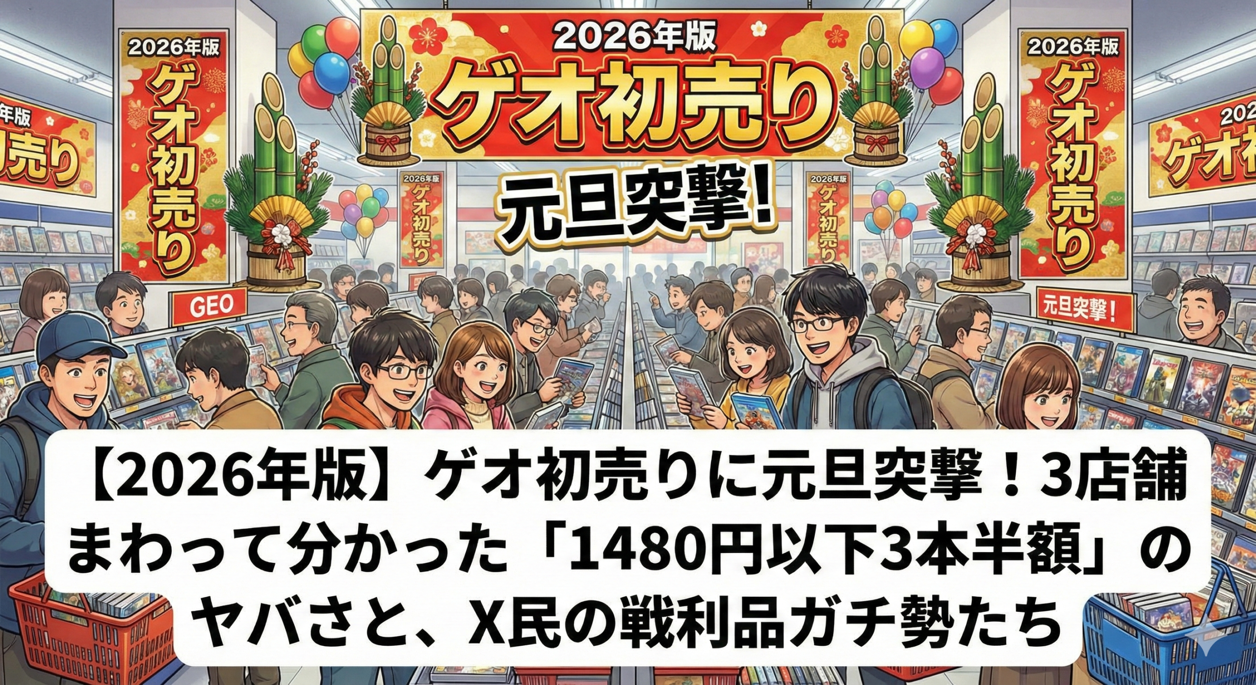 2026年1月1日。元旦の朝9時、Xのタイムラインを開いた瞬間に目に飛び込んできたのが「ゲオの初売り行ってきました」というポストの数々でした。ゲームソフトがずらっと並んだ戦利品写真、「3本以上で半額は神」というコメント、そして「棚がスカスカだった」という報告。